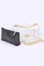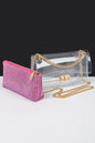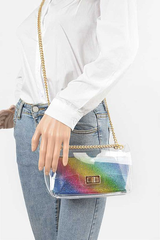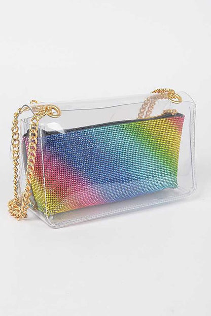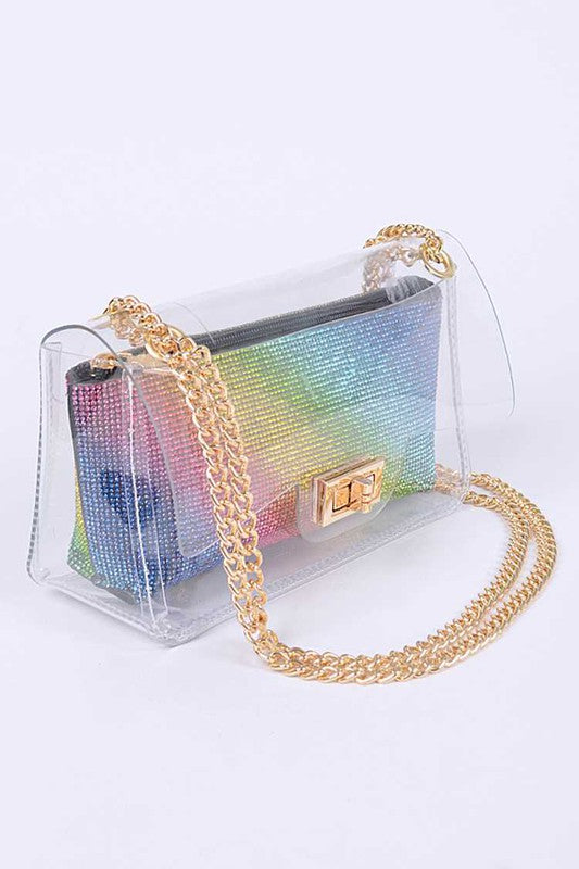 Width - 8.5"Height - 4.5"Depth - 2.75"Twist Lock ClosureInner Pouch IncludedComposition - PVC, Rhinestone & Mix MetalsLead & Nickel Compliant