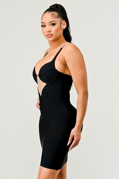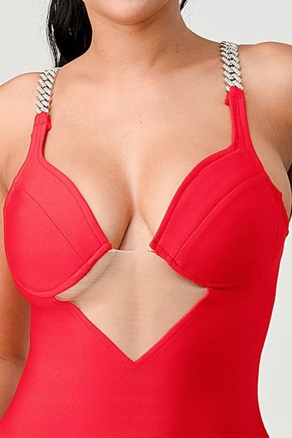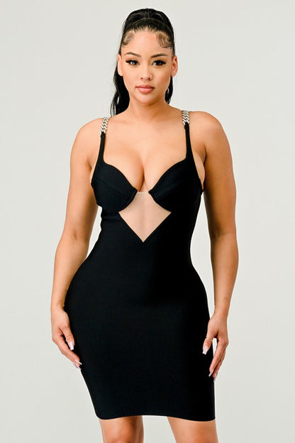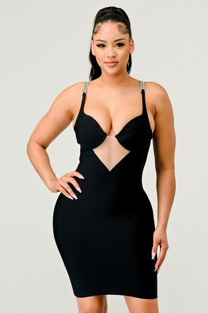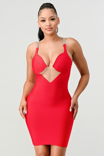 This Spicy Bandage Mini Dress is the perfect balance of edgy and classic, with its daring cut-out detail, chain embellished sleeves, and bodycon fit. Crafted from high-quality fabric, this imported beauty is available in red and black.