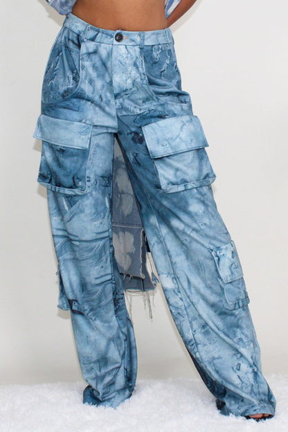 Multiple 3D Pockets: These cargo pants are designed with multiple 3D pockets, offering both style and functionality. Wide Leg: With their wide leg silhouette, these pants provide a relaxed and comfortable fit. Urban Style: The tie dye print and cargo design give these pants an urban and streetwear-inspired look. Button Front: The pants feature a button front closure, adding a classic touch to the overall design. High Waist and Elastic: Designed with a high waist and elastic waistband, these pants offer a flattering fit and comfortable wear.