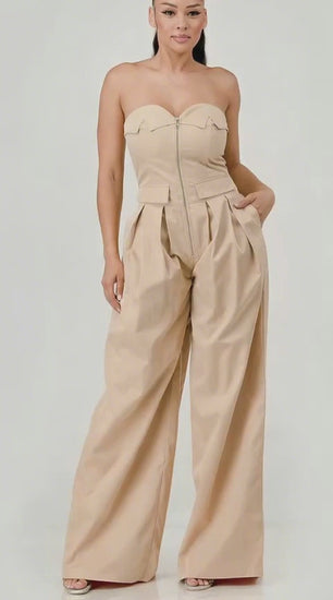 Minimalist yet striking, this strapless jumpsuit features a structured bodice with a front zipper closure and flap pocket accents at the waist. The wide-leg silhouette is enhanced with front pleating for volume and movement, creating a sophisticated, runway-ready look.