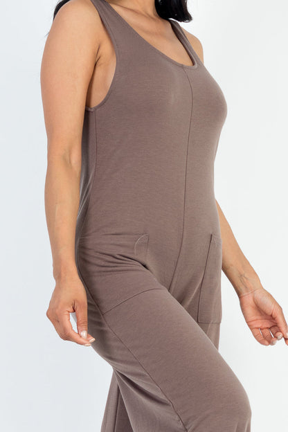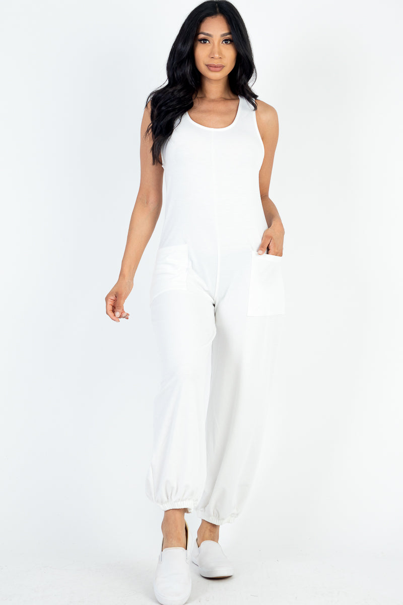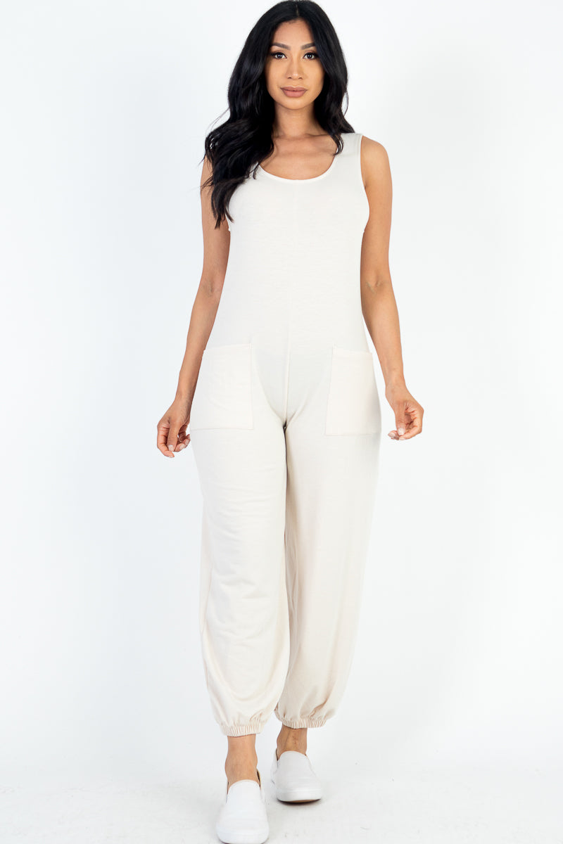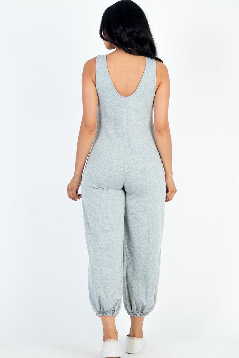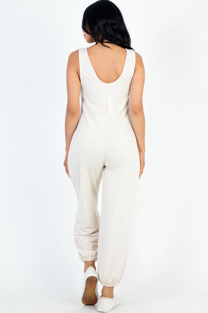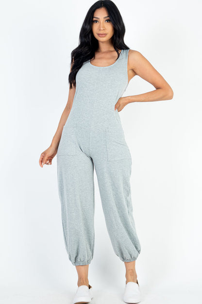 - Casual sleeveless French terry jumpsuit featuring a scoop neck style and front pockets.