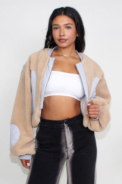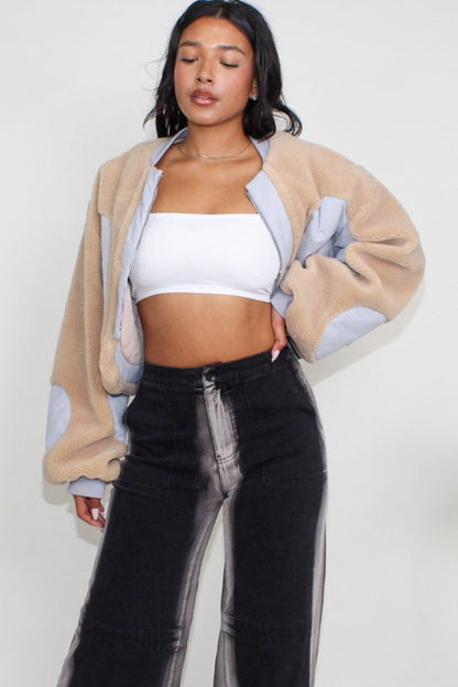 Elevate your winter wardrobe with our Oversized Sherpa Fur Cropped Jacket, a cozy blend of fashion and comfort. This stylish piece combines Beige and Grey contrast colors, creating a trendy look that stands out effortlessly.