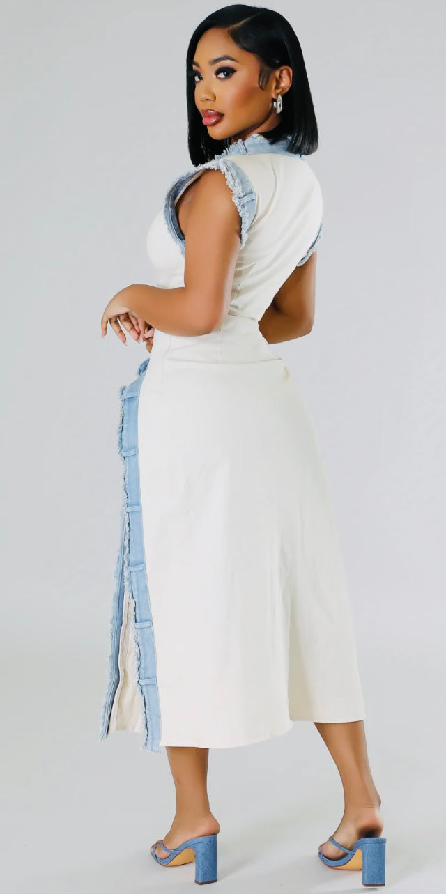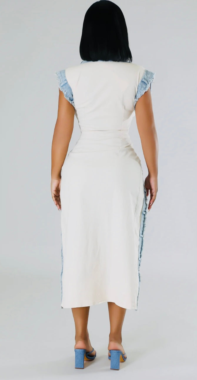 It features a pullover design with a deep v-neckline accented with a single, oversized denim button for an added statement. The silhouette is form-fitting and sleeveless, with playful frayed edges around the armholes that give it a deconstructed yet chic vibe.