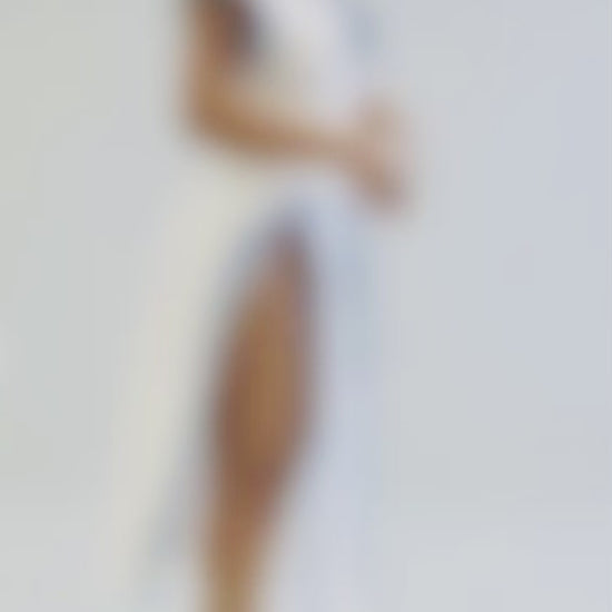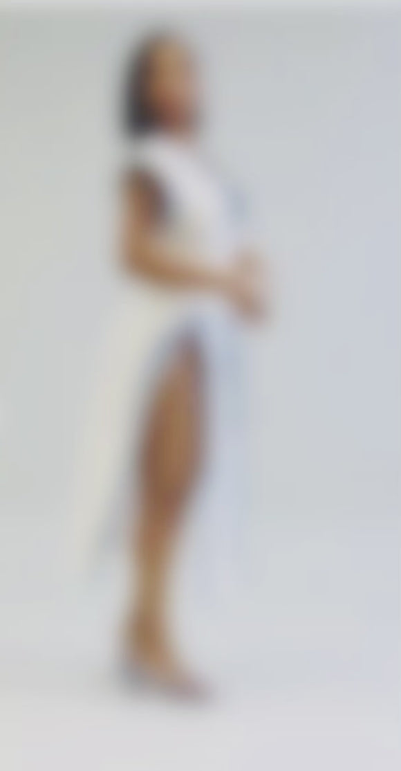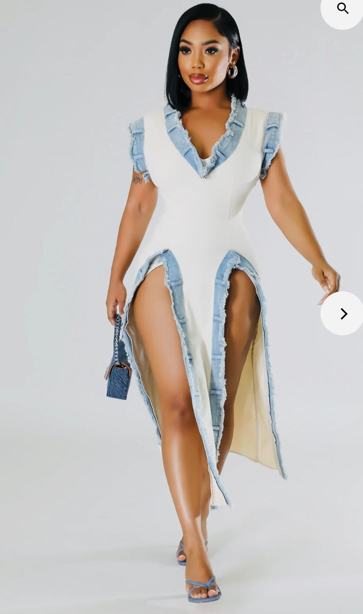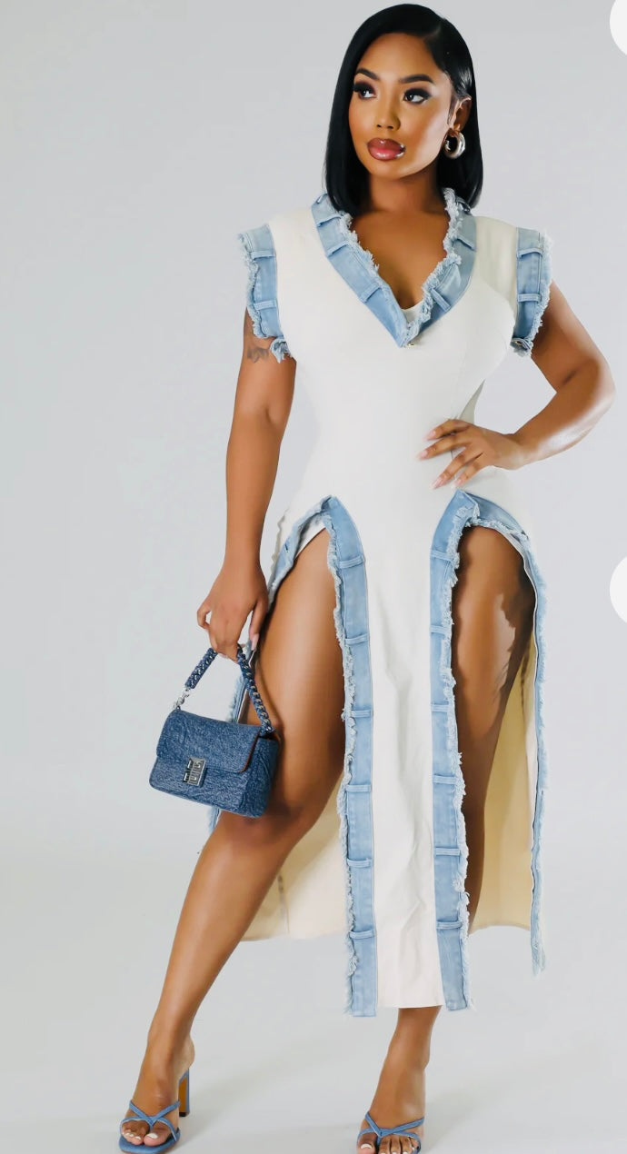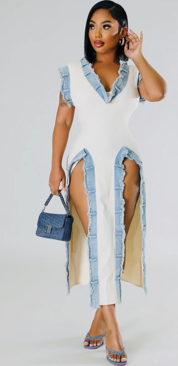 Adding to the avant-garde feel, the dress presents a high-low hem with front panels resembling a pair of jeans cut open from the waist down, complete with waistbands, belt loops, and pocket outlines.
