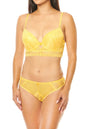 Add some color to your weekend brunch plans with our lace bra set in color mimosa. Featuring lace overlay and sheer matching thong.