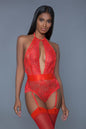 - Halter neckline with adjustable fasting hook on the back - Front plunging cut out - Back adjustable fasting hook - Thong-style bottom - Detachable suspenders that add a seductive touch - Hosiery (1912) not included