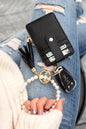 A pearl key ring bracelet, double sided credit card slots, one pocket, and a fold over button snap closure. Faux Pearl Design.