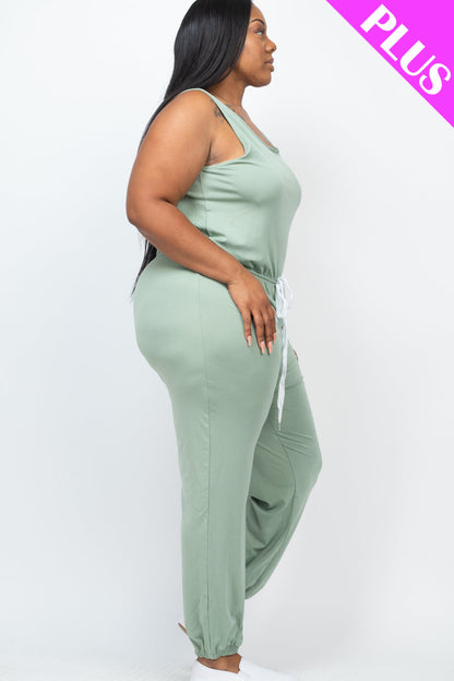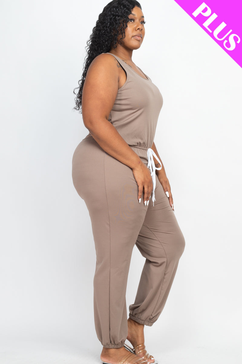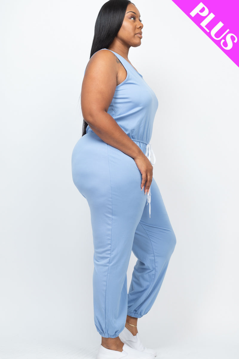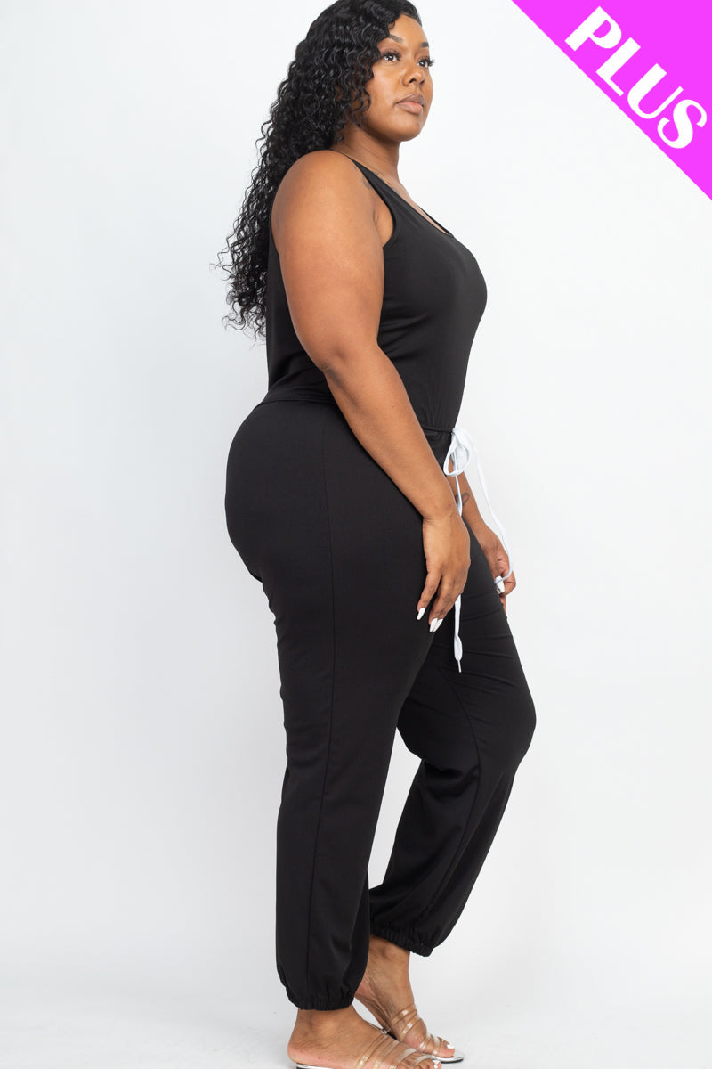 - Plus size elasticized waist jogger jumpsuit featuring a drawstring