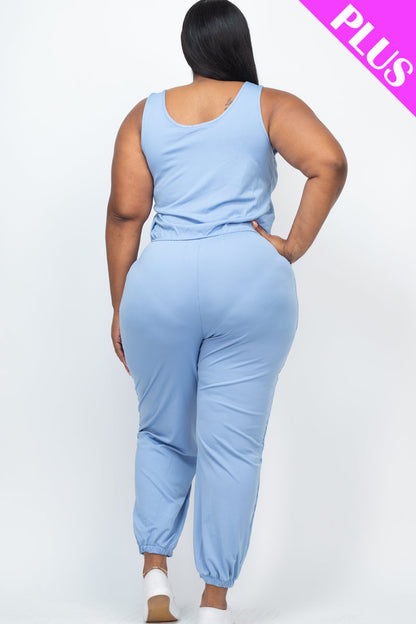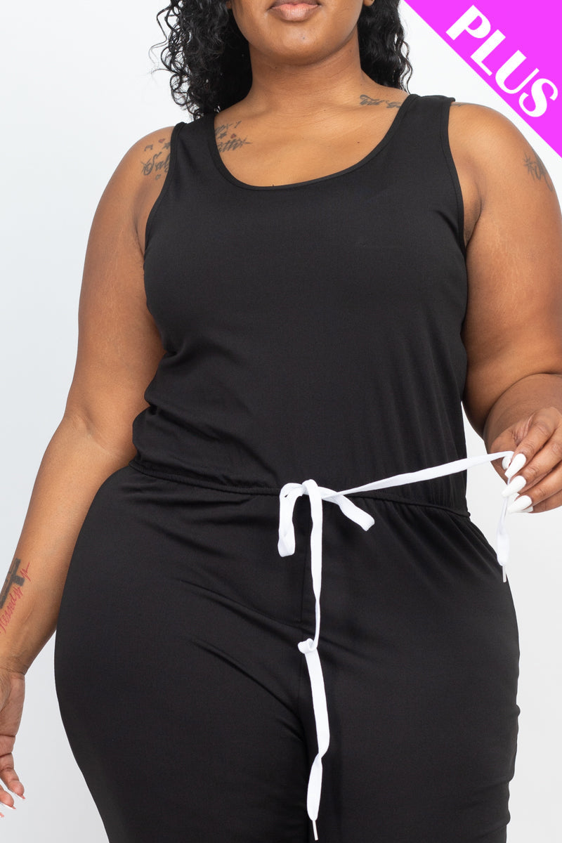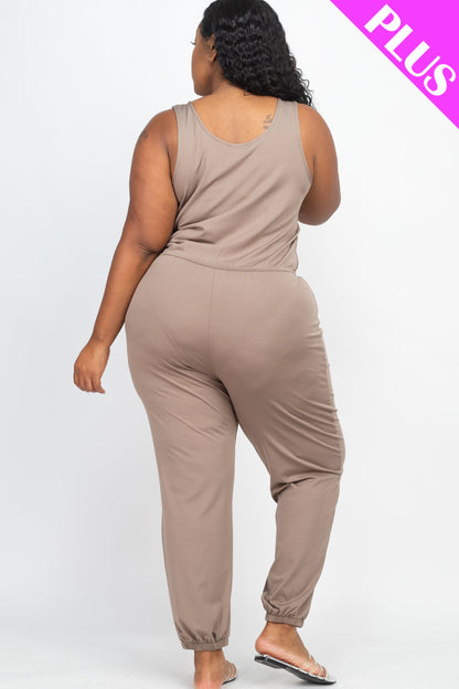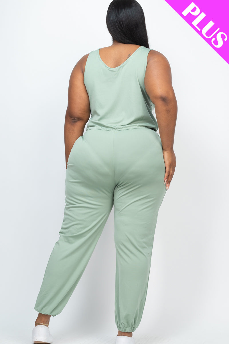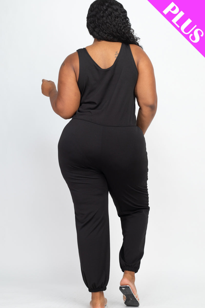 - Plus size elasticized waist jogger jumpsuit featuring a drawstring