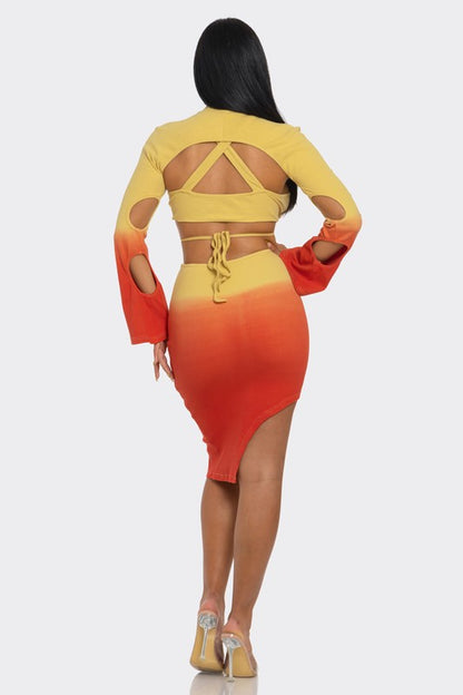 This set boasts a bold gradient design reminiscent of a sunset, transitioning from a warm yellow at the top to a deep fiery orange at the hem. The fabric hugs the body to showcase the silhouette, while the unique cut-out details around the midriff add a daring touch that's both modern and sensual.