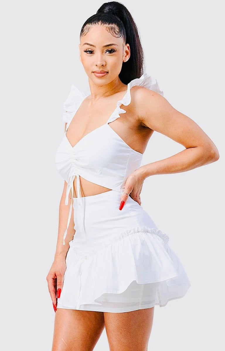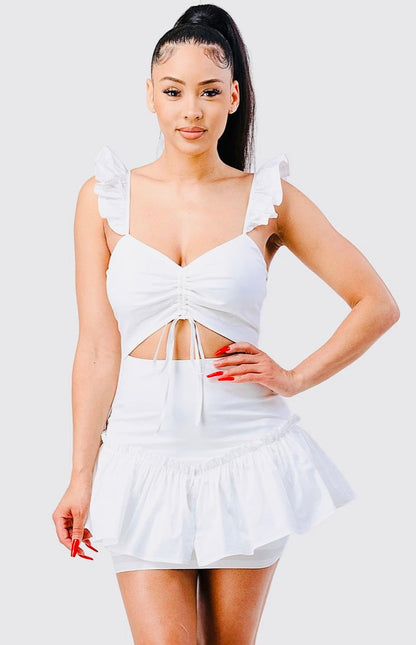 Sweetheart With Drawstring Bow Cutout Ruffled Flutter Sleeves Mini Dress