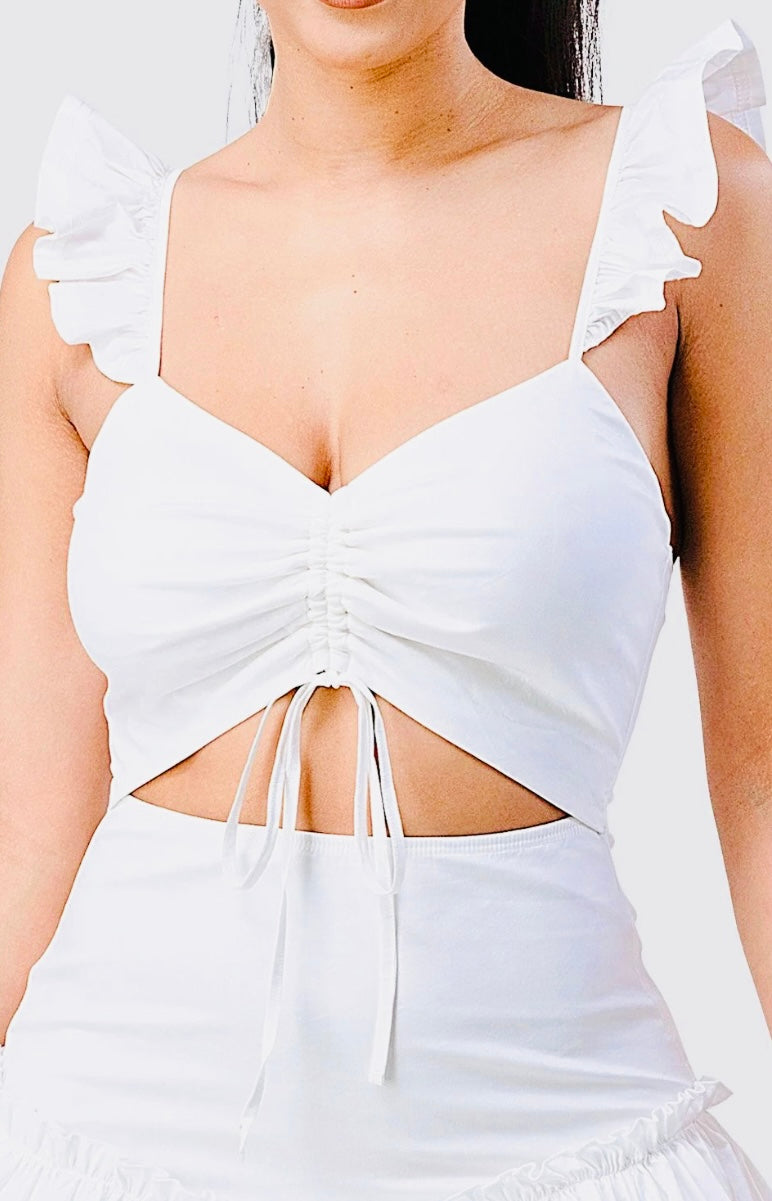 Design: Features a sweetheart neckline with drawstring bow cutout detailing and ruffled flutter sleeves, adding a touch of femininity and allure.