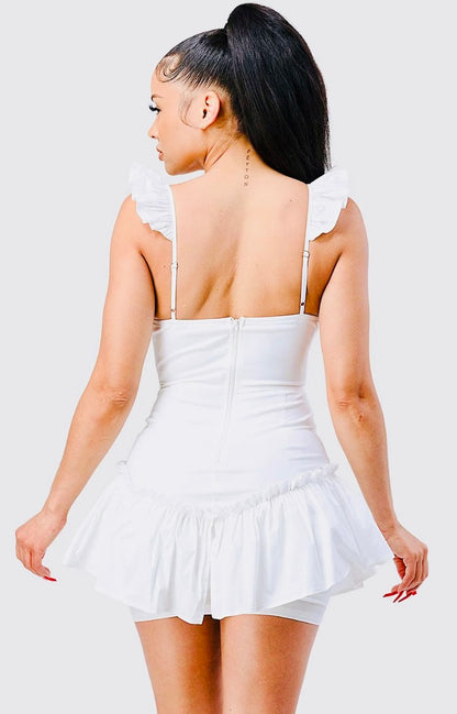 Elevate your wardrobe with our Cotton Sweetheart with Drawstring Bow Cutout Ruffled Flutter Sleeves Mini Dress, a delightful piece designed to exude charm and sophistication. Crafted from a blend of Cotton, Nylon, and Spandex, this dress offers a perfect balance of comfort and style.