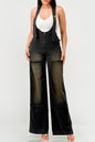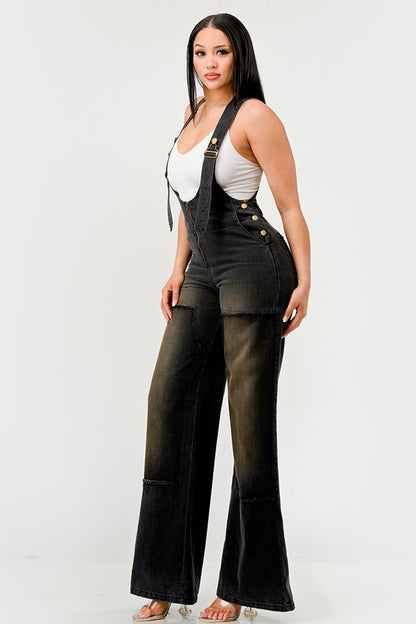These overalls feature a sleek, fitted bodice that transitions into a relaxed leg silhouette, offering a modern twist on a classic staple. The rich, dark wash denim is accented with subtle fading and whiskering, lending an edgy yet sophisticated look. Functional elements include a front zipper closure, adjustable straps with metallic hardware, and ample pocket space with side, back, and chest compartments. The frayed hem adds a touch of urban ruggedness, making it a versatile piece for street-inspired fashion or casual outings.