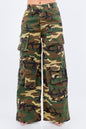 Wide Leg Utility pants features front cargo pockets, front and back pockets, Print Denim, Elastic waistband, Rise 12.5", Inseam 30.5", Leg Open 12",